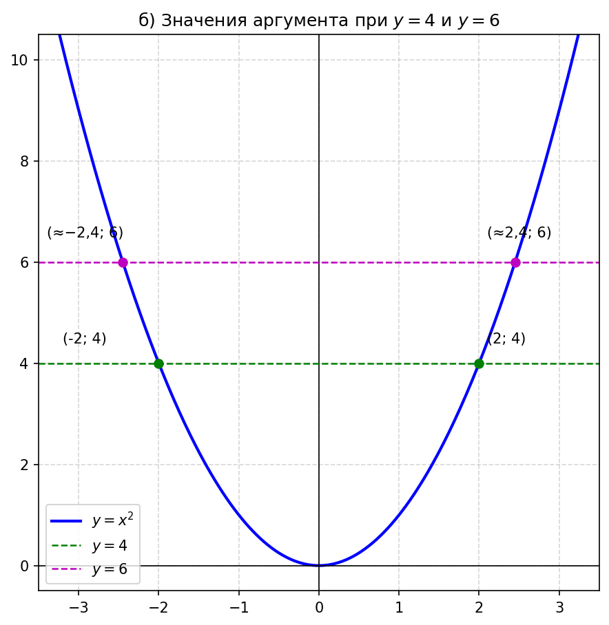 б) значения аргумента, при которых значение функции равно 4; 6;