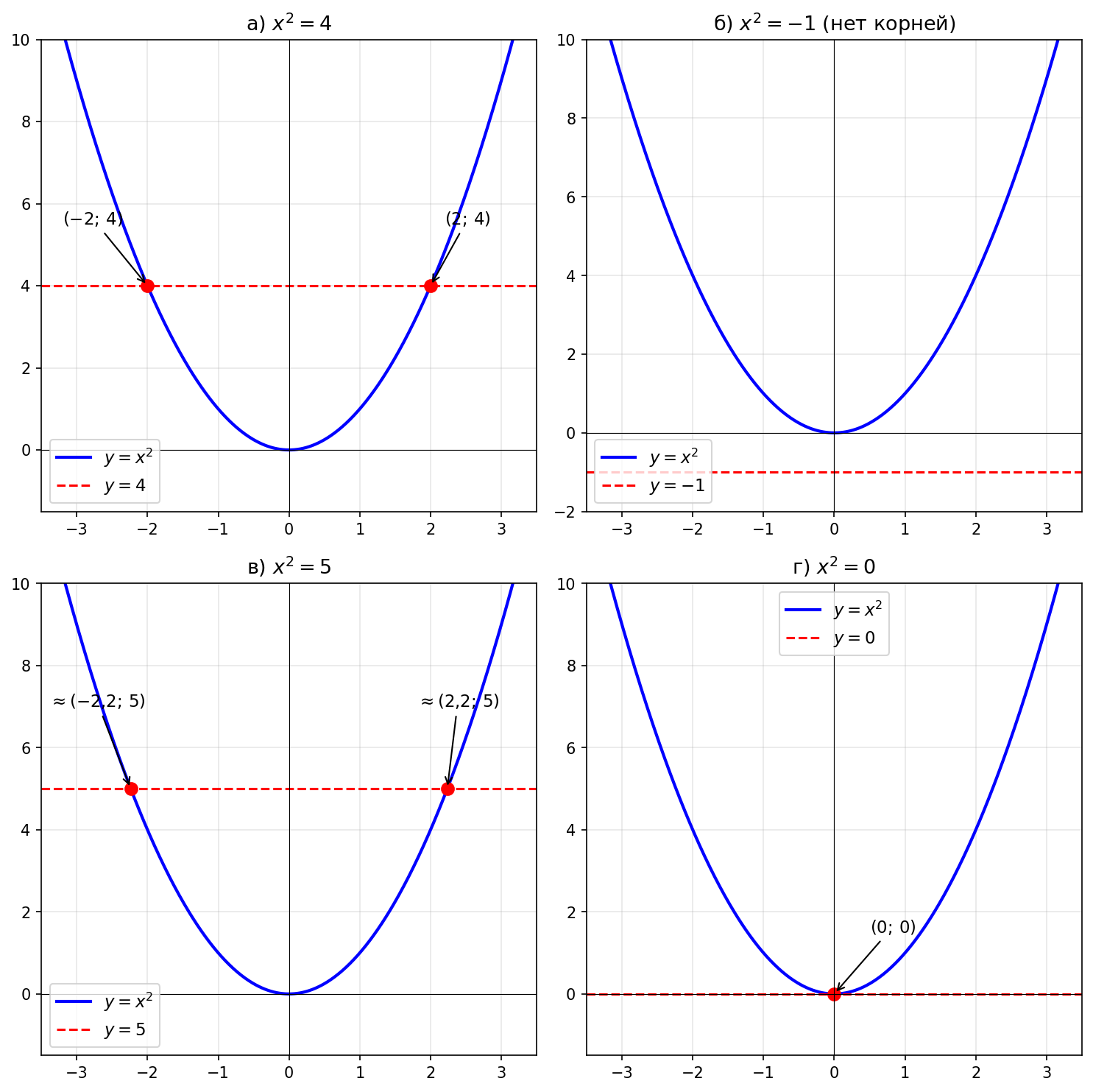 3) Сделайте вывод о числе корней уравнения $x^2 = a$ при различных значениях $a$.