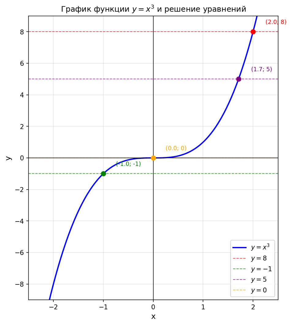 3) Сделайте вывод о числе корней уравнения $x^3 = a$ при различных значениях $a$.