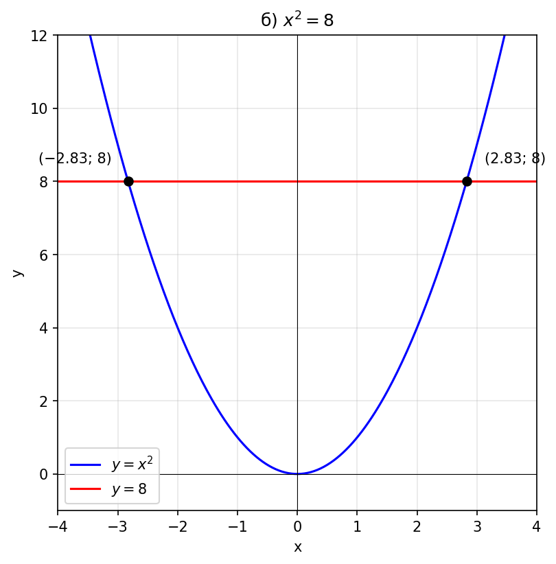 б) $x^2 = 8$;