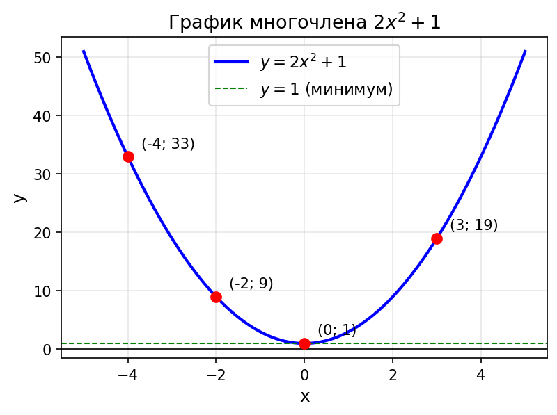Условие: Найдите значение многочлена $2x^2 + 1$ при $x = 0$; $-2$; $3$; $-4$. Существует ли такое значение $x$, при котором значение многочлена равно нулю; отрицательно?