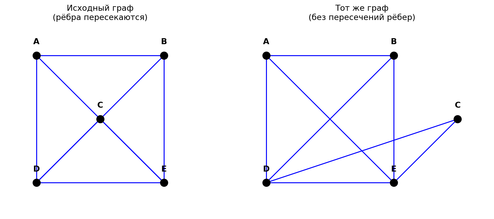 Ниже приведён пример — типичный граф, в котором рёбра пересекаются (слева), и тот же граф после движения вершин без пересечений (справа):