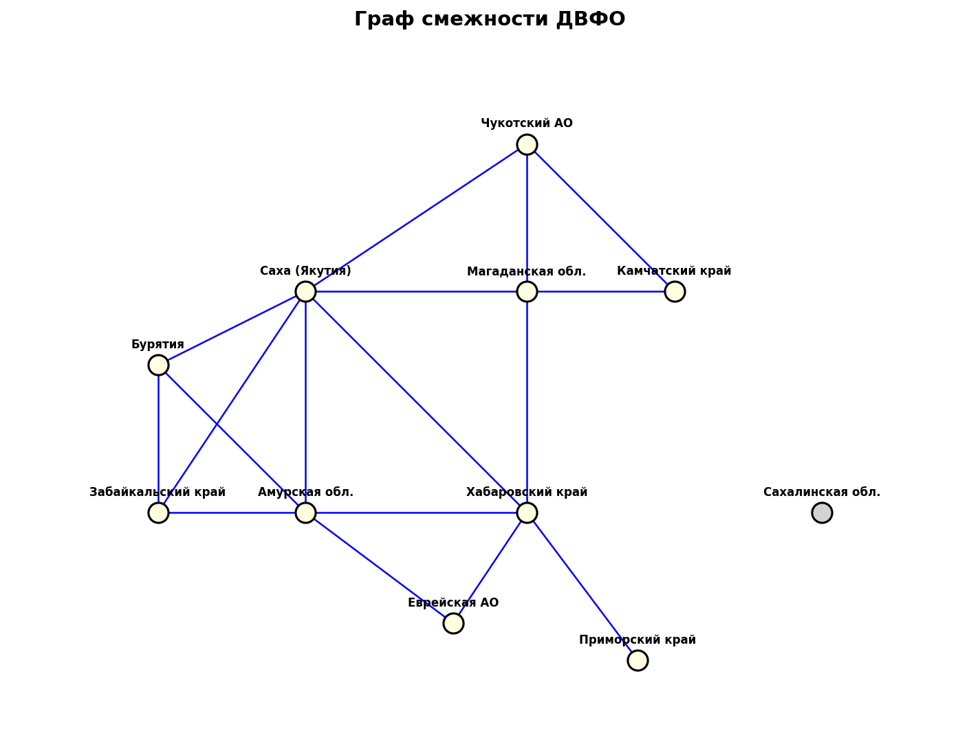 а) В графе ДВФО есть изолированная вершина — Сахалинская область (расположена на островах и не имеет сухопутных границ с другими регионами округа).