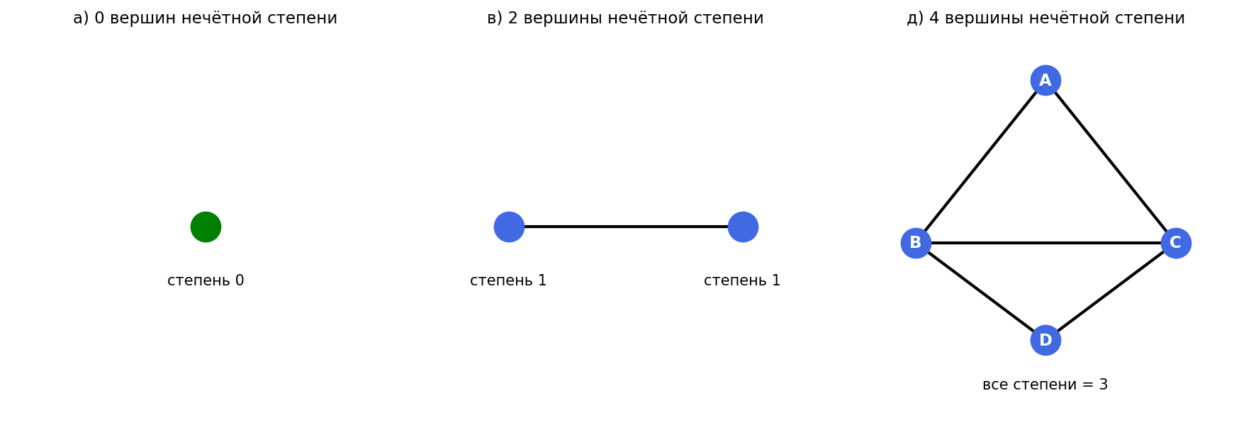 Значит, количество вершин нечётной степени может быть равно 0, 2, 4, … — любому чётному числу, но не может быть нечётным.