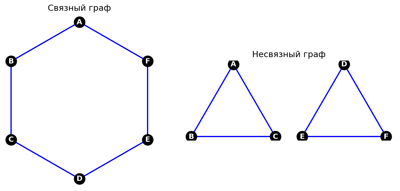 В обоих графах каждая вершина имеет степень 2, но первый граф связный (любые две вершины соединены путём), а второй — нет (например, из нельзя попасть в