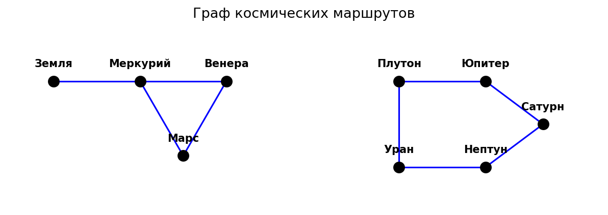 Ответ: добраться с Земли до Плутона нельзя, так как граф несвязный — Земля и Плутон находятся в разных компонентах связности, между которыми нет ни одного маршрута.