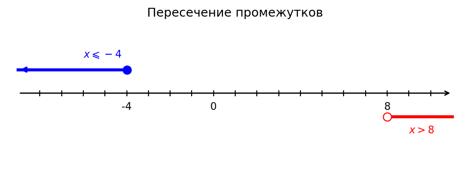 Условие: При решении системы двух неравенств получились решения обоих неравенств: $x \leqslant -4$ и $x > 8$. Какое множество является решением системы?