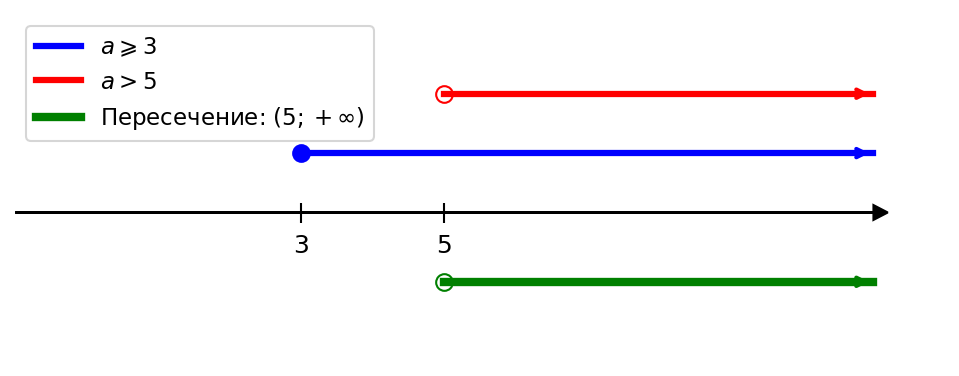 Условие: Решая систему неравенств, школьник нашёл, что переменная $a$ должна удовлетворять одновременно двум утверждениям: $a > 5$ и $a \geqslant 3$. Запишите множество всех значений $a$, которые являются решением задачи.