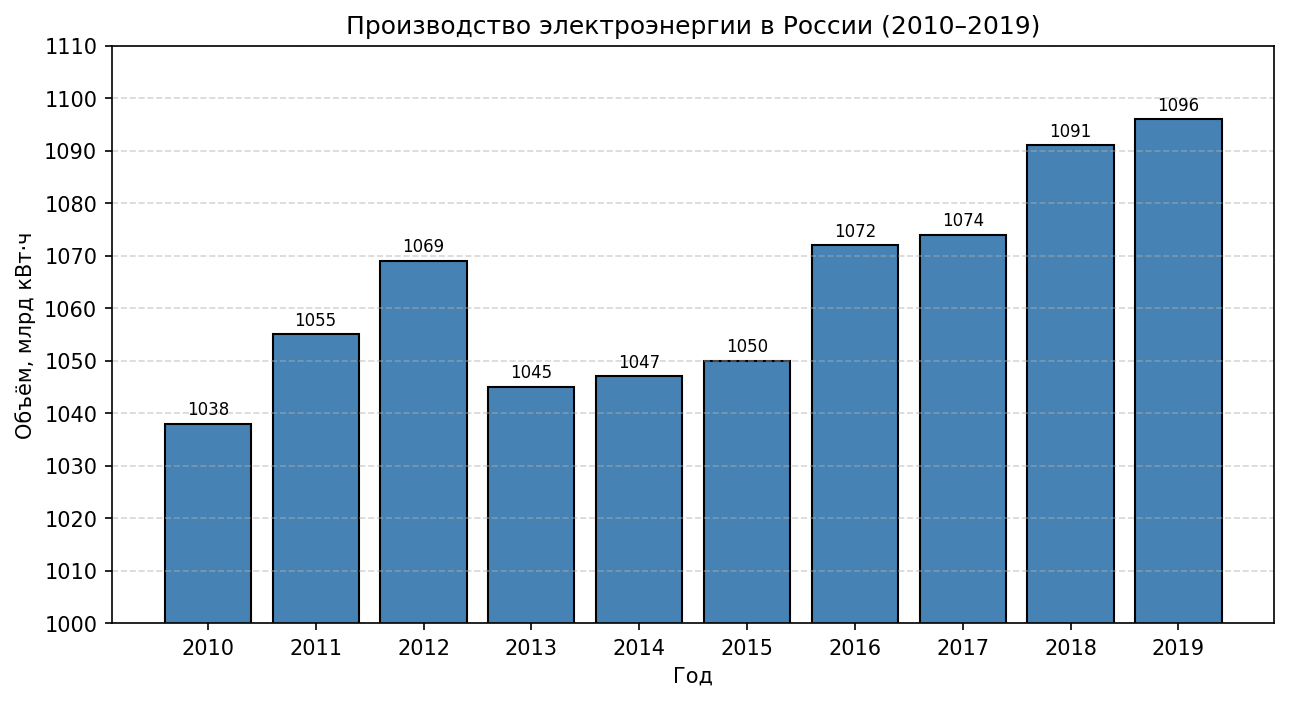 б) Нет, выработка электроэнергии не меняется сильно год от года. Все значения находятся в пределах от 1038 до 1096 млрд кВт·ч — разброс составляет менее 6% от среднего значения.