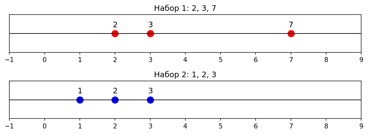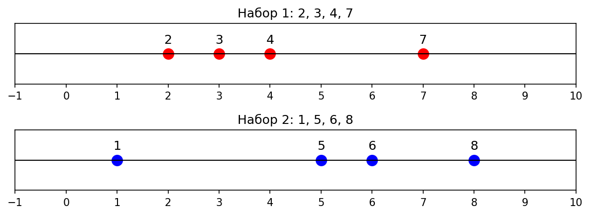 Дисперсия первого набора больше: . Это видно и на числовой прямой — числа первого набора разбросаны сильнее.