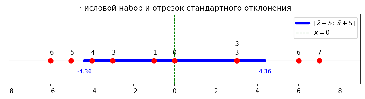 а) Найдите отрезок, который получается, если отступить от среднего влево и вправо на одно стандартное отклонение.