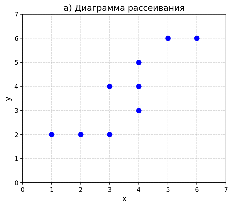 б) Построим диаграмму рассеивания для точек (1; 2), (2; 3), (3; 3), (3; 4), (3; 2), (4; 3), (4; 4), (5; 2), (6; 3).