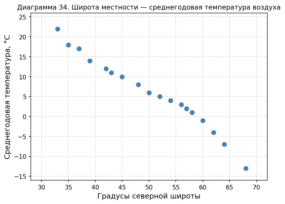 Диаграмма 34. Широта местности — среднегодовая температура воздуха