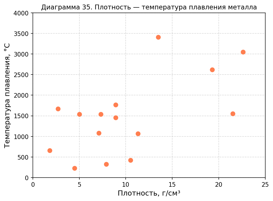 Диаграмма 35. Плотность — температура плавления металла