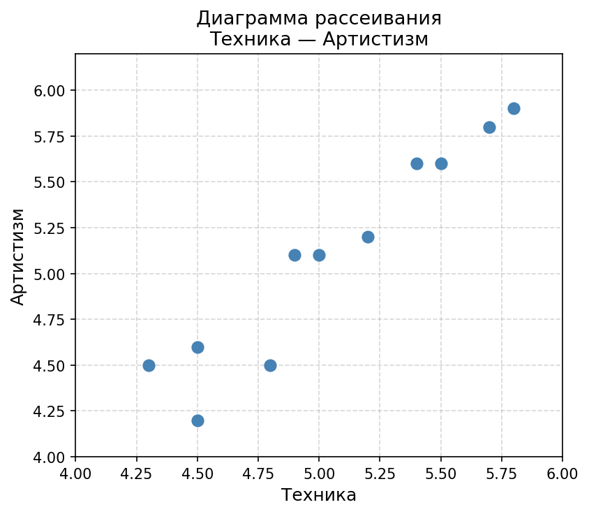 На диаграмме видно, что точки группируются вдоль прямой, направленной вправо и вверх: чем выше оценка за технику, тем выше, как правило, оценка за артистизм. Облако рассеивания достаточно узкое, точки плотно прилегают к воображаемой прямой.