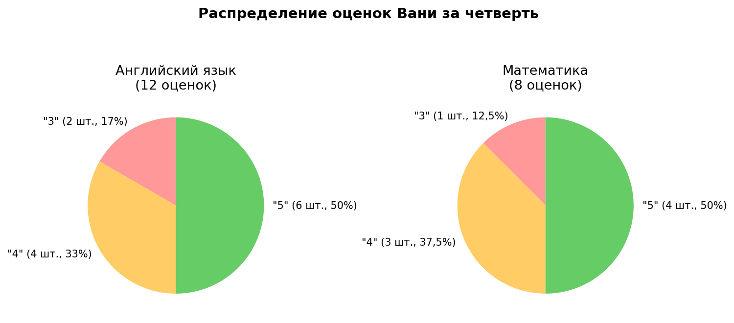 Условие: В течение четверти Ваня получил следующие оценки: по английскому языку — 4, 5, 5, 4, 3, 5, 4, 4, 3, 5, 5, 5; по математике — 4, 3, 5, 5, 4, 5, 5, 4.