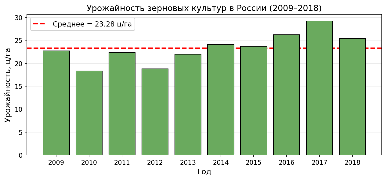 Ответ: средняя урожайность за 2009-2018 гг. равна 23,28 ц/га.