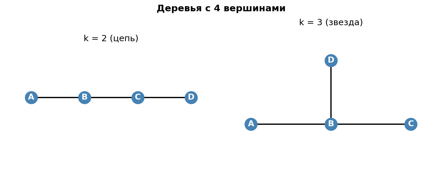 Также , поскольку если бы все 4 вершины были концевыми (степени 1), сумма степеней была бы 4, а не 6.