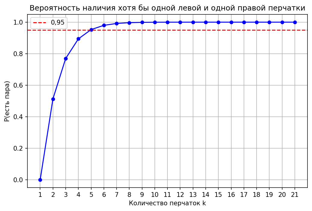Нам нужно, чтобы вероятность наличия пары была не меньше 0,95, то есть: