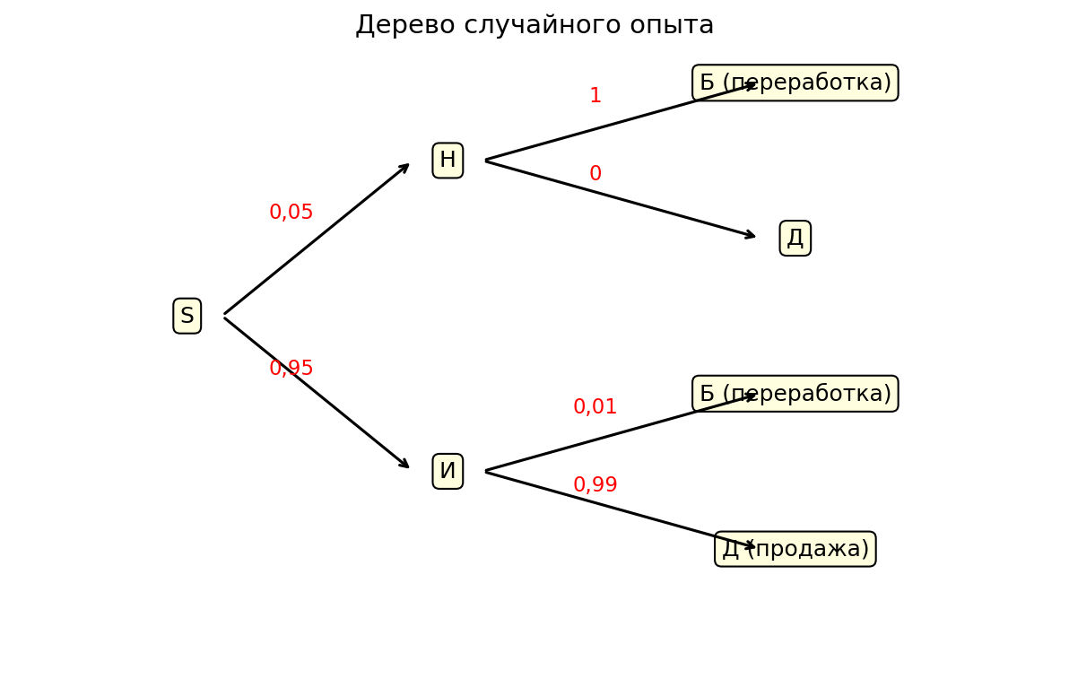 Решение. Построим дерево случайного опыта. Обозначим буквой Н событие «лампочка неисправна», а буквой И — «лампочка исправна». Буквой Б обозначим «лампочка забракована», а буквой Д — «лампочка допущена в продажу».
