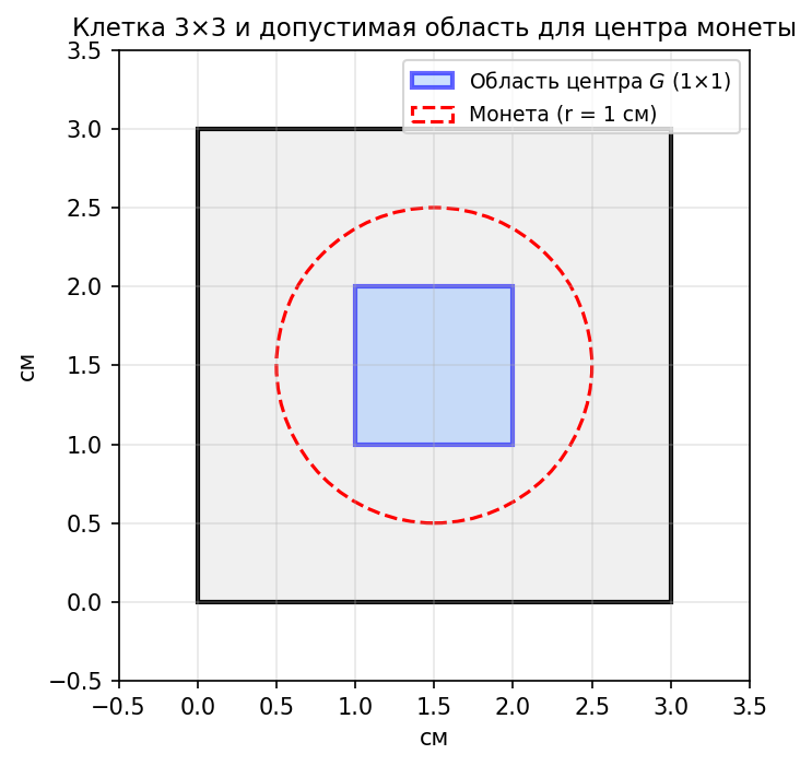 Центр монеты диаметром 2 см (радиус 1 см) может упасть в любую точку клетки размером 3 × 3 см. Это фигура — квадрат со стороной 3 см.