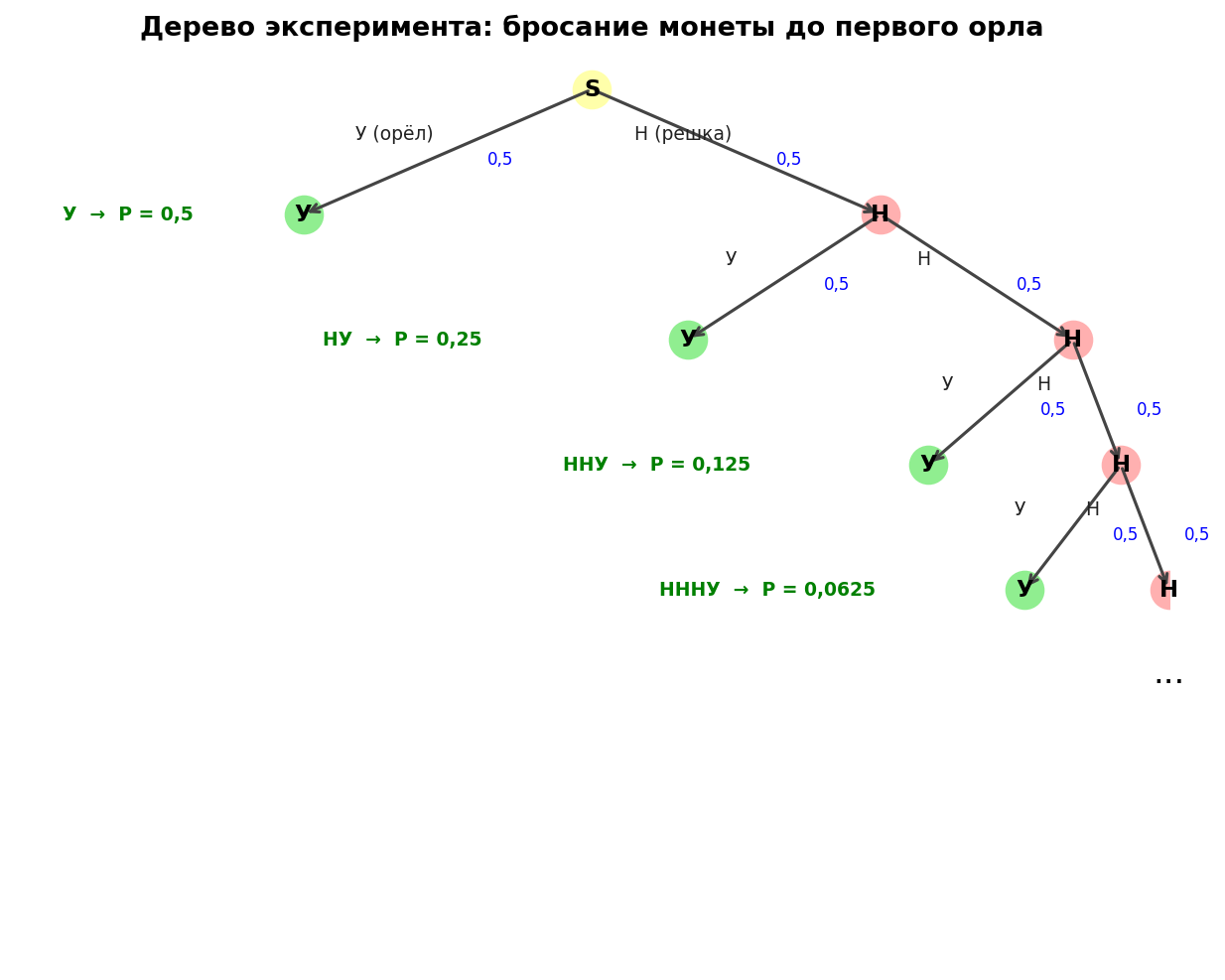 Монету бросают до первого орла. Здесь успех (У) — орёл, неудача (Н) — решка. Вероятности: .