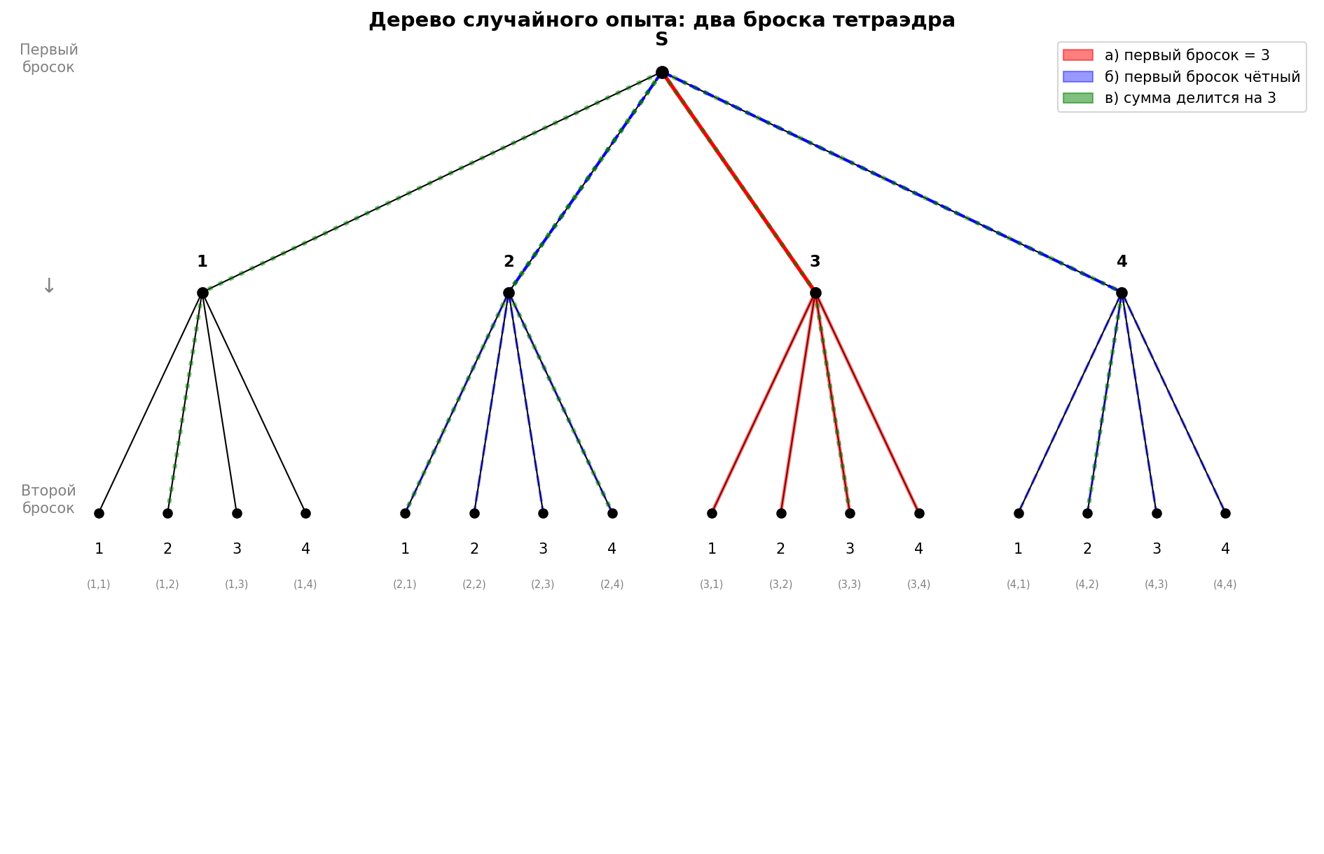 Из начальной вершины выходят 4 ребра (результат первого броска), и из каждой вершины первого уровня — ещё 4 ребра (результат второго броска). Всего элементарных событий: