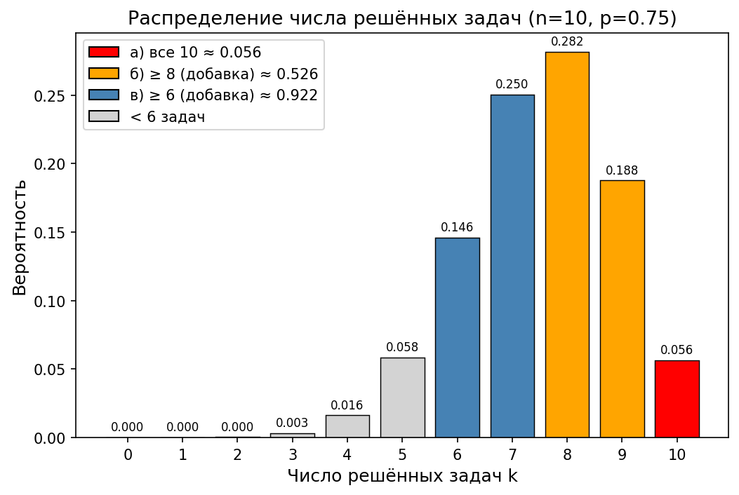 Условие: Олегу задали 10 одинаковых по трудности задач. Вероятность того, что Олег решит каждую отдельную задачу, равна 0,75. Найдите вероятность того, что Олег решит: