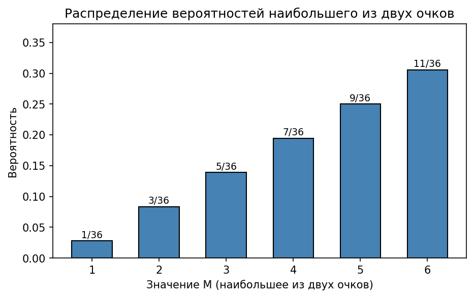 Пусть — наибольшее из двух выпавших очков. Величина