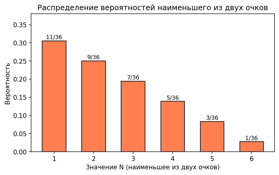 Пусть — наименьшее из двух выпавших очков. Величина