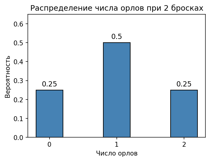 Условие: Монету бросают 2 раза. Постройте распределение и найдите дисперсию случайной величины «число выпавших орлов».