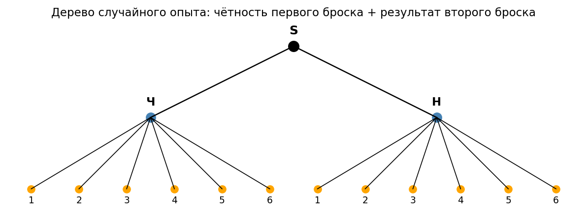Построим дерево этого опыта. Из начальной вершины идут два ребра вниз — к вершинам Ч и Н (результат первого броска: чётное или нечётное). От каждой из этих двух вершин идут 6 рёбер вниз — к вершинам 1, 2, 3, 4, 5, 6 (конкретный результат второго броска).