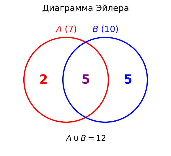 Условие: В ходе некоторого случайного опыта событию $A$ благоприятствуют 7 элементарных событий, событию $B$ — 10 элементарных событий. 12 элементарных событий благоприятствуют событию $A \cup B$. Сколько элементарных событий благоприятствуют событию: