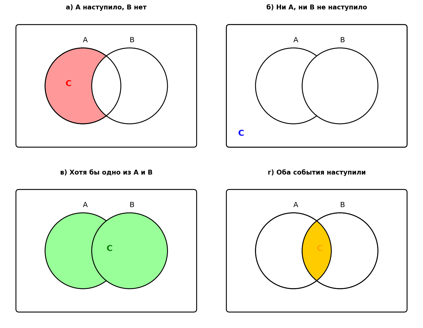Условие: На диаграмме Эйлера (рис. 29) изображены события $A$ и $B$. Нарисуйте диаграмму в тетради и укажите на ней событие $C$, которое состоит в том, что: