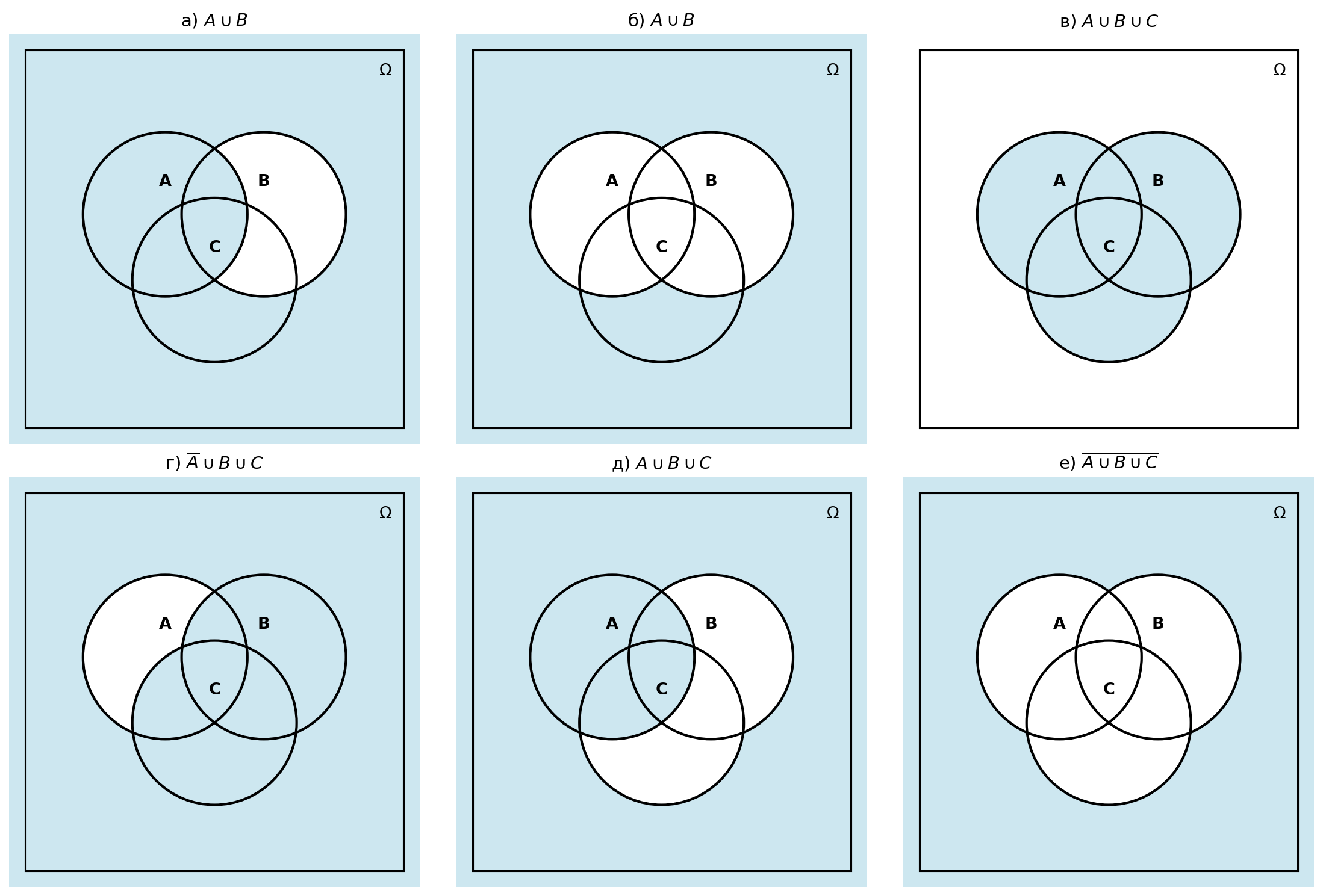 е) — дополнение объединения всех трёх событий. Закрашиваем только область вне всех трёх кругов.