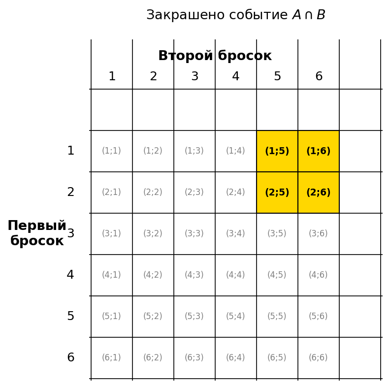 а) В таблице этого опыта укажите элементарные события, благоприятствующие событию $A \cap B$.