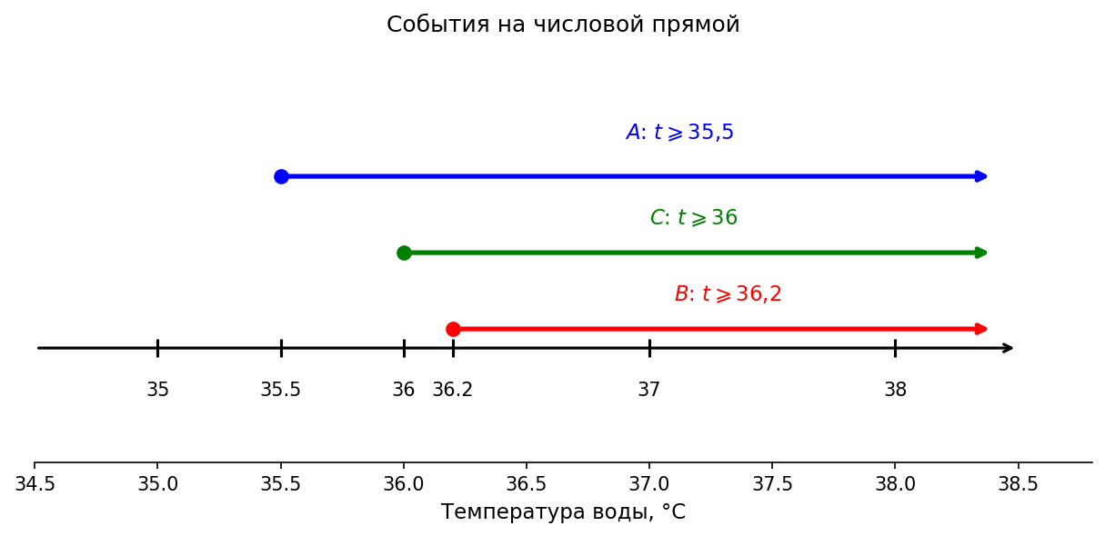 Изобразим события на числовой прямой. Каждое событие — это луч, направленный вправо: