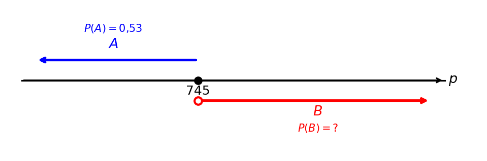 Условие: Вероятность того, что в случайный момент времени атмосферное давление в некотором городе не выше 745 мм рт. ст., равна 0,53. Найдите вероятность того, что в случайный момент давление превышает 745 мм рт. ст. Изобразите соответствующие события на числовой прямой.