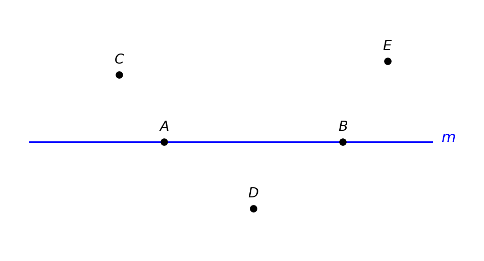 Проведём прямую m и отметим на ней точки A и B. Затем отметим точки C, D, E, не лежащие на прямой m.
