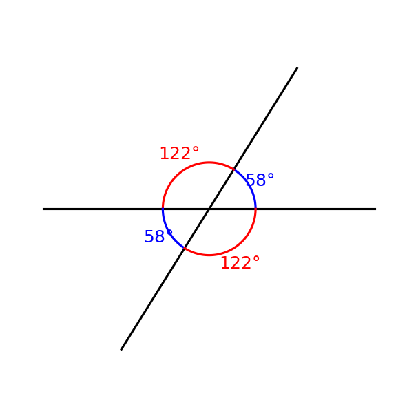 При пересечении двух прямых образуются две пары вертикальных углов: два угла по 122° и два угла по 58°.