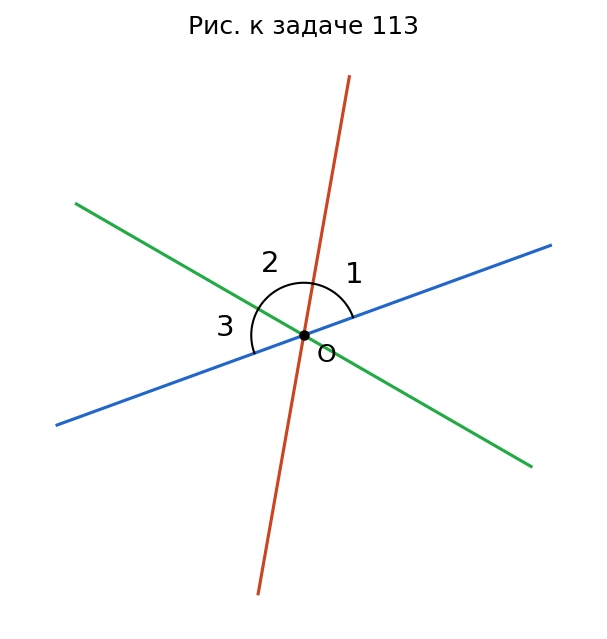 Рис. 96: три прямые пересекаются в одной точке; между ними отмечены углы 1, 2, 3 — три смежных угла при пересечении прямых.