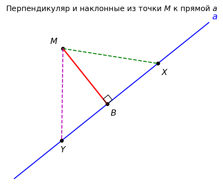 - зелёный штриховой отрезок MX и фиолетовый штриховой отрезок MY — наклонные, проведённые из точки M к прямой a.