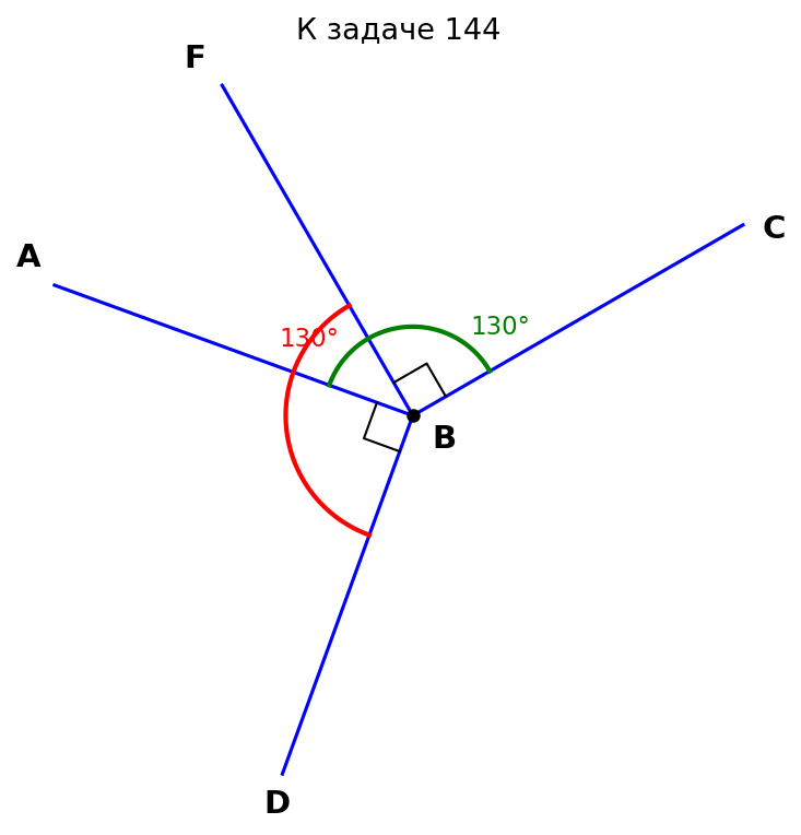 Условие: Из вершины угла $ABC$, равного $130°$, проведены лучи $BD$ и $BF$ так, что $BD \perp AB$, $BF \perp BC$, луч $BF$ принадлежит углу $ABC$, луч $BA$ принадлежит углу $DBF$. Найдите угол $DBF$.