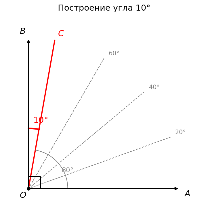 То есть отложим от луча OA четыре раза угол 20°, получив лучи, образующие с OA углы 20°, 40°, 60°, 80°. Последний луч OC образует с OA угол 80°.