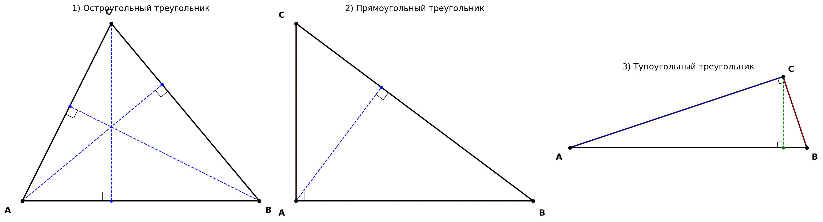 3) Тупоугольный треугольник — один угол тупой. Две высоты попадают на продолжения сторон (основания высот лежат вне треугольника).