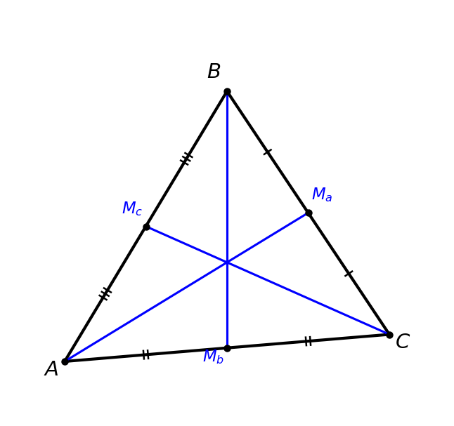 — середины сторон BC, AC и AB соответственно. Равные отрезки отмечены одинаковым количеством чёрточек.