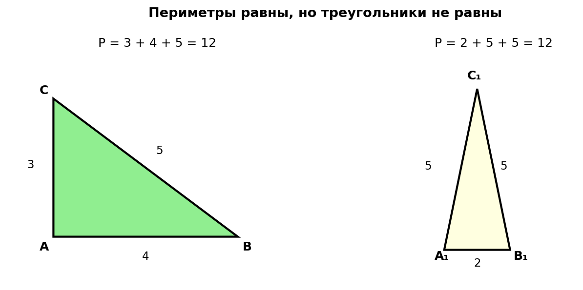 Треугольник со сторонами 3, 4, 5 и треугольник со сторонами 2, 5, 5 имеют одинаковый периметр P = 12, но их нельзя совместить наложением, так как их стороны различны. Значит, из равенства периметров не следует равенство треугольников.