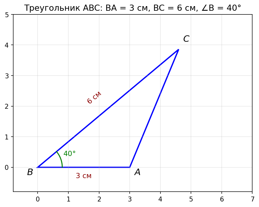 Треугольник ABC — искомый: BA = 3 см, BC = 6 см, ∠ B = 40°.