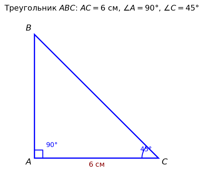 Треугольник ABC — искомый: AC = 6 см, ∠ A = 90°, ∠ C = 45°.