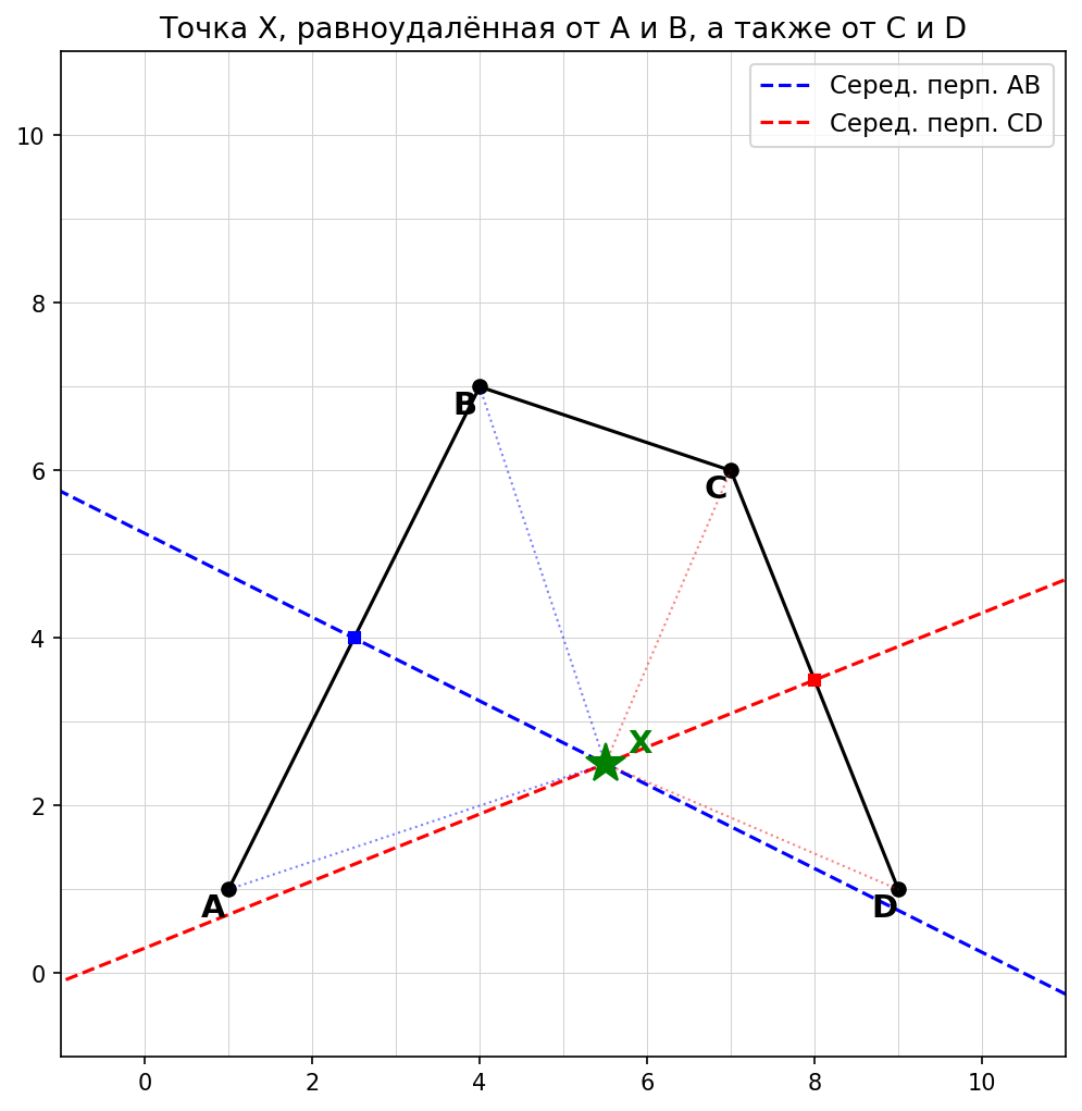 Искомая точка X — это точка пересечения серединных перпендикуляров отрезков AB и CD.